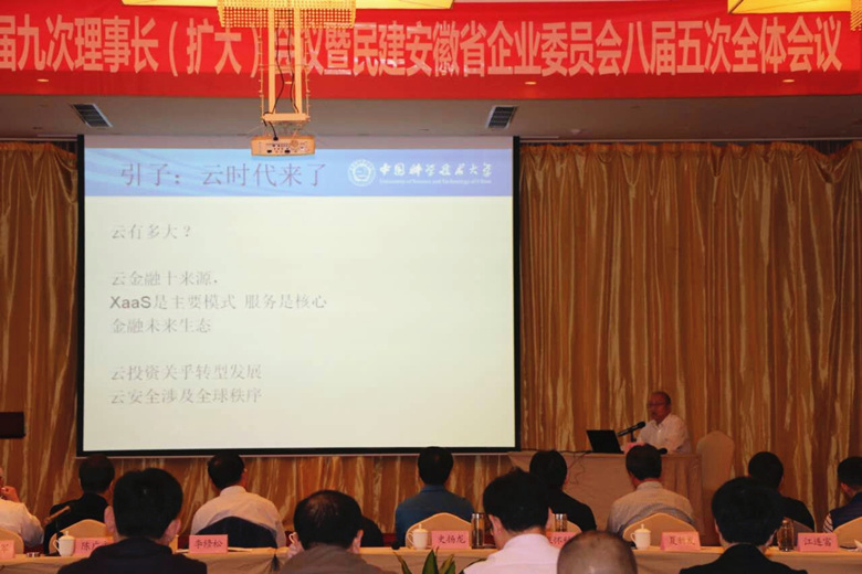 会议特别邀请原民建安徽省主委、中国科大管理学院方兆本教授,作了题为“云投资和投资云”的专题报告,结合十八届五中全会精神,就大数据和云计算如何助力供给侧改革,促进传统产业转型升级,从“电商化、数据化、创新化、服务化”的角度,对“云投资和投资云”的前沿发展、中小企业融资和转型升级发展等问题进行了深入剖析。