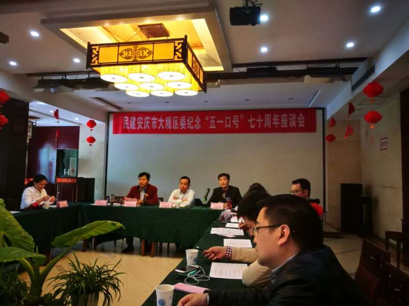 4月15日下午,民建安庆市大观区委在黄梅山庄酒店会议室举行了“五一口号”发布70周年座谈会。民建安庆市委常委、企联会会长江连富出席会议。民建大观区委主委白永飞以及在宜区委班子全体成员、各支部主委、骨干会员、新会员参加学习座谈。