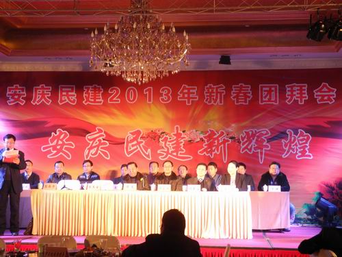 龙年共庆辉煌日; 蛇岁同奔锦绣程。2012年元月26日下午,由民建安庆市委主办,安庆(民建)企业家联谊会承办的主题为“安庆民建新辉煌”2013新春团拜会在天域大酒店举行。中共安庆市委统战部常务副部长邵光、副部长江宏滨、余玉金,民建安庆市委副主委刘来富、石再华、汪爱萍,中共迎江区政协副主席、统战部部长钱军、大观区委统战部部长周水旺、宜秀区政协副主席、统战部部长唐克志等领导和嘉宾与安庆民建全体会员一起参加了团拜会,共贺新春。