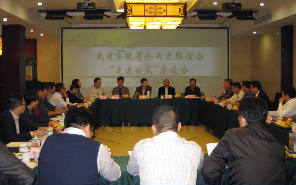 2013年10月18日下午,民建安徽省企业家联谊会在安庆民建会员企业莲会所召开“走进安庆”座谈会。民建安徽省委专职副主委陈广文,民建安徽省委副秘书长、宣传部长何世平、组织部长史扬龙,省企联会副秘书长徐斌、安庆市人大常委会副主任、市委会主委童学军、专职副主委石再华以及民建合肥、安庆、芜湖、黄山、铜陵、滁州、淮北、淮南等兄弟地市企联会近20名代表出席会议?;嵋橛?/span>省企联会常务副理事长、安庆(民建)企联会会长江连富主持。