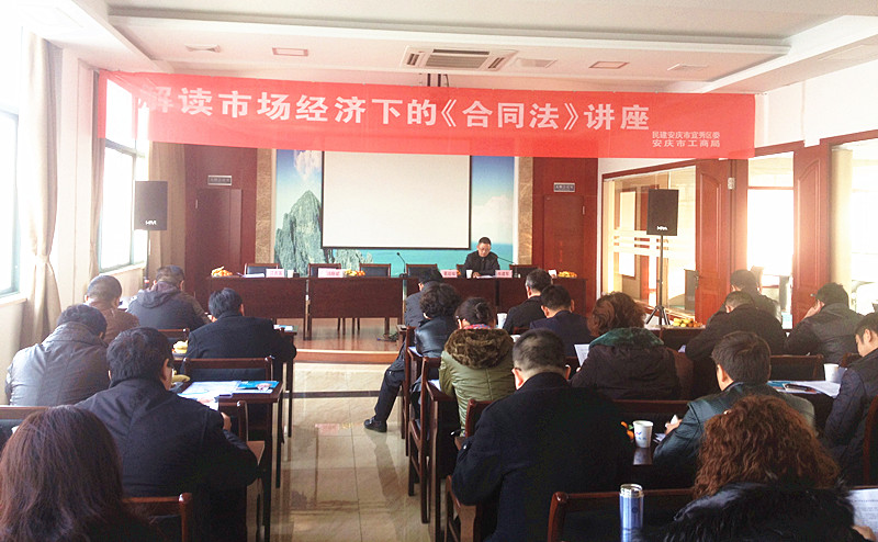 根据民建安庆市委会服务会员企业发展的要求,2013年12月8日下午,经民建安庆市宜秀五支部主任李晓明、副主任占德如热心联系,民建安庆市宜秀区委与市工商局联合主办的“解读市场经济下的《合同法》讲座”,在民建会员所属企业百科实业会议室顺利举行。讲座由区委主委丁健主持,民建安庆市各区委会、各专委会、企联会的负责人和30多位企业家参加了本次讲座。民建市委专职副主委石再华,市开发区工商分局局长葛廷瑞,市工商局法规科科长张建军,民建市委常委、秘书长冯晓斌,民建市委常委、企联会会长江连富等领导出席会议。