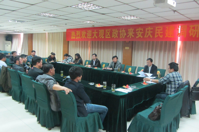 2014年4月29日,安庆市大观区政协民族宗教和港澳台侨联络委员会委员在区政协副主席张剑雄带领下来安庆民建调研,受到民建安庆市委会的热烈欢迎。张主席一行首先参观了安庆市东部新城综合写字楼和民建安庆市委会办公场所,随后双方举行了座谈会,进行会务交流。会议由民建安庆市委会专职副主委石再华主持。