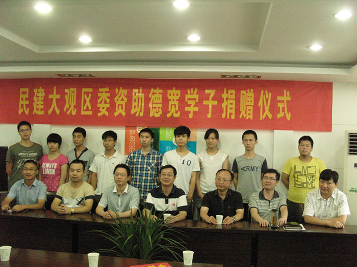 8月17日上午,民建安庆市大观区委捐资助学活动在安庆市大观区德宽街道会议室举行。德宽街道所辖六个社区的七名贫困大学生、六个社区负责人、民建大观区委班子成员及六个支部负责人、德宽街道相关同志参加了仪式。民建安庆市委会专职副主委石再华、中共安庆市委统战部党派科科长马自水、民建安庆市委常委江连富、区委统战部常务副部长汪庆生等应邀出席捐赠仪式。活动由德宽街道党工委书记、街道办事处主任魏学贤主持。