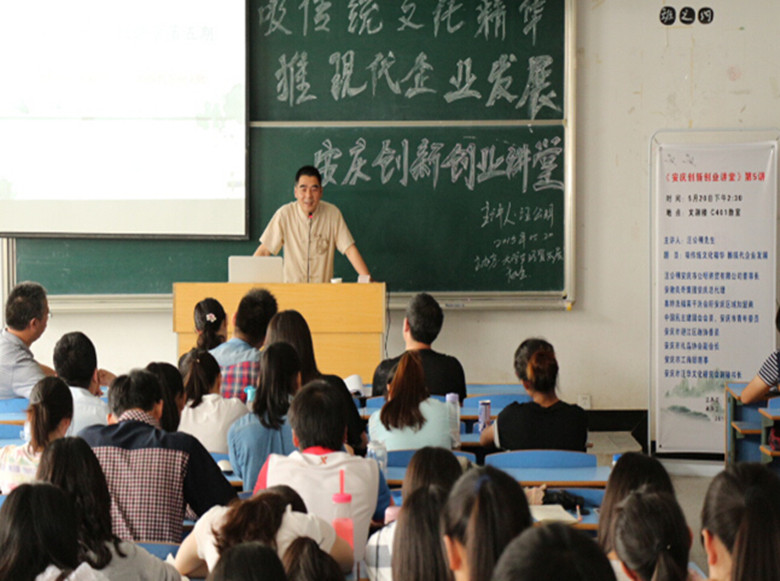 由安庆师范学院经济与管理学院主办、大学生经济与贸易协会协办的“安庆创新创业讲堂”第五讲于5月20日下午开讲。本次讲堂由民建安庆市迎江五支部副主委、公明商贸有限公司董事长汪公明主讲。经济与管理学院党政领导、部分教师和100多名学生到堂聆听。讲堂由经济与管理学院党总支书记李亦亮教授主持。