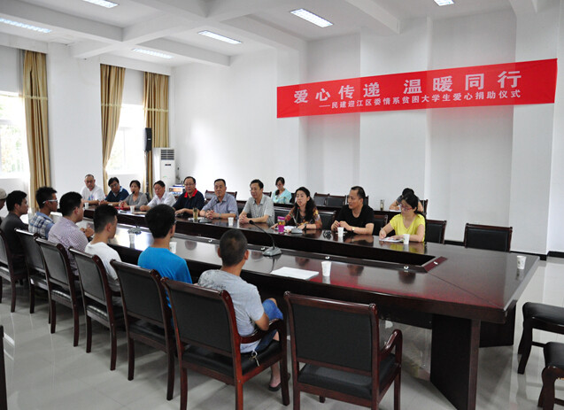 8月7日下午,民建安庆市迎江区委与中共安庆市迎江区委统战部、迎江区妇联联合举办的“爱心传递,温暖同行”——情系贫困大学生爱心捐助仪式在安庆市迎江区政府一楼会议室举行。迎江区委常委叶进明,迎江区政协副主席、统战部部长钱军等应邀出席捐助仪式。民建迎江区委班子成员、捐资的爱心企业家、迎江辖区各街道办事处负责人及受助的八名大学新生参加了仪式?;疃捎玖飨涡】≈鞒?。